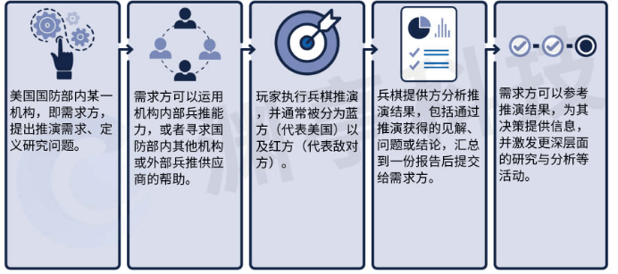 兵棋推演是对战争冲突的模拟,玩家可以在模拟中推演相关决策的制定并承担决策带来的后果。美国战争部广泛运用兵棋推演来模拟冲突,以此产生见解并为决策提供支持。下图呈现了美国战争部(有时与外部兵推供应商合作)展开兵推的大致流程。