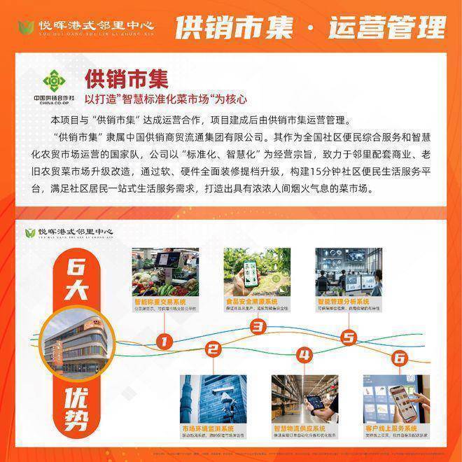 、央企运营与模式创新项目引入中国供销集团旗下“供销市集”作为品牌运营商,依托央企资源与农贸运营经验,构建“全链路保障体系”。1、四大核心优势•央企背景:中国供销集团是农业领域头部央企,具备强大的政策资源与品牌公信力。•统一运营:执行“统一招商、统一管理、统一营销、统一收银”模式,保障市场秩序与商业品质。•供应链整合:依托供销系统全国农产品基地网络,为商户提供“低价、优质、稳定”的货源渠道。•智慧经验:拥有超百个智慧农贸市场成功案例,可快速复制“标准化+智能化”的成熟运营模式。2、线平台:接入中国供销集团助农平台,助力农产品上行,为商户拓展B端采购渠道。•供销臻选线上商城:打造项目专属线上平台,实现“线验+线上下单+社区配送”一体化服务。•抖音直播矩阵:以“供销帮您”官方账号开展农贸直播带货,帮助商户打通“线上销售渠道”,实现“一店双收”。