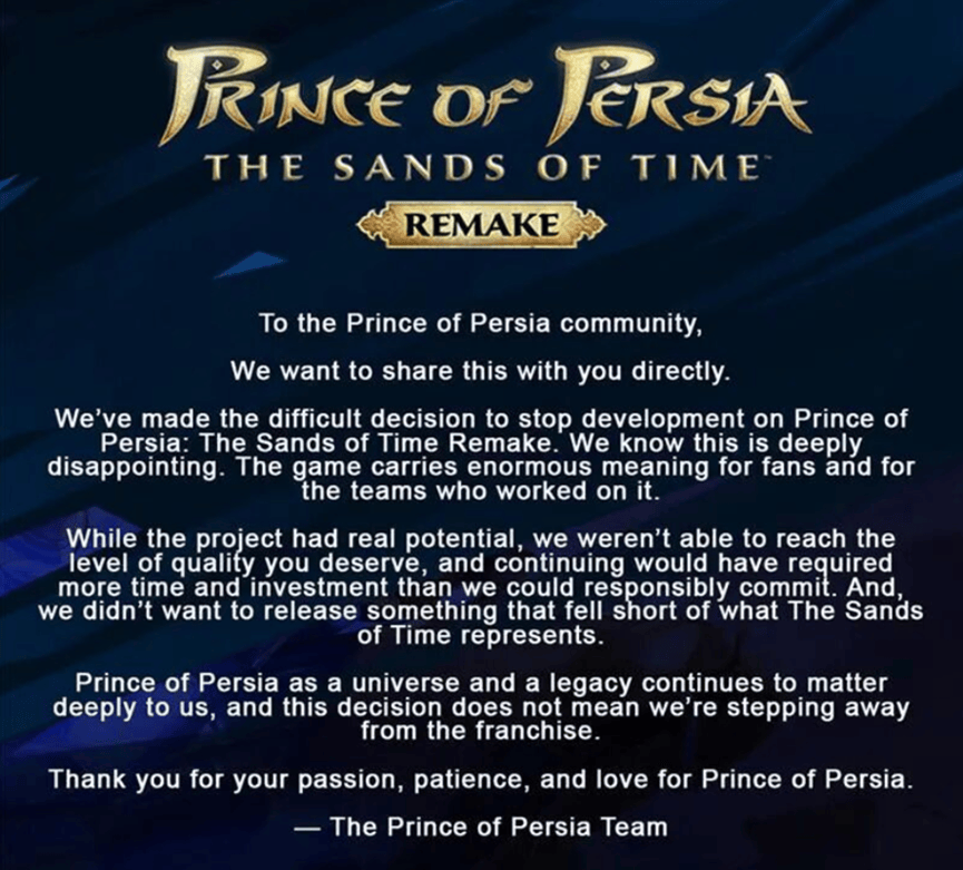 1月22日,育碧官方宣布,在经过为期两个月的项目审查后,决定取消6款游戏的开发,其中包括备受关注的《波斯王子:时之砂 重制版》、3款原创IP、1款未公布的新作,以及1款手游。另外,育碧还有7款未透露名字的游戏将会延期,瑞德斯德哥尔摩和加拿大哈利法克斯的两间工作室被关闭,并将有进一步的裁员计划。