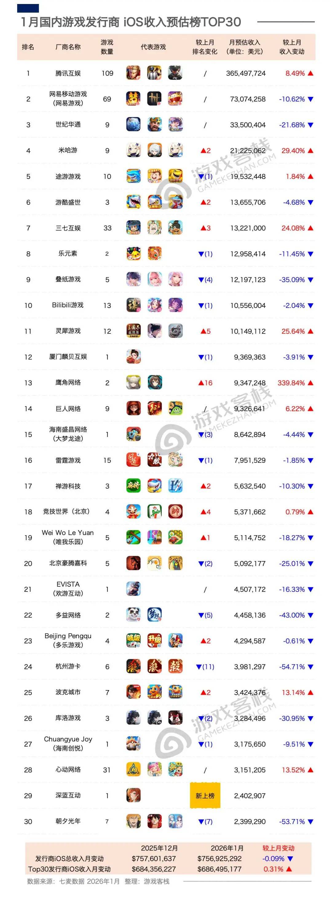多宝体育,多宝体育官方网站,多宝体育官网,多宝登录,多宝体育下载,多宝体育网页登录,多宝体育app,多宝体育试玩,多宝体育入口,多宝体育注册网址,多宝体育登录,多宝官网,多宝网址,多宝注册,多宝电竞我们根据七麦数据发布的数据,整理出“2026年1月国内游戏发行商iOS收入预估榜TOP30”。1月国内游戏发行商iOS总收入7.56亿美元,环比下降0.09%,其中TOP30总收入6.86亿美元,环比上升0.31%。26年刚开年就有两款重磅产品《逆战:未来》和《终末地》公测,也均获得出色成绩,为2026年打响开年第一枪。同时,很多厂商也提前上线春节版本,新的玩法内容丰富的福利活动,提前布局春节档的“玩家争夺战“,