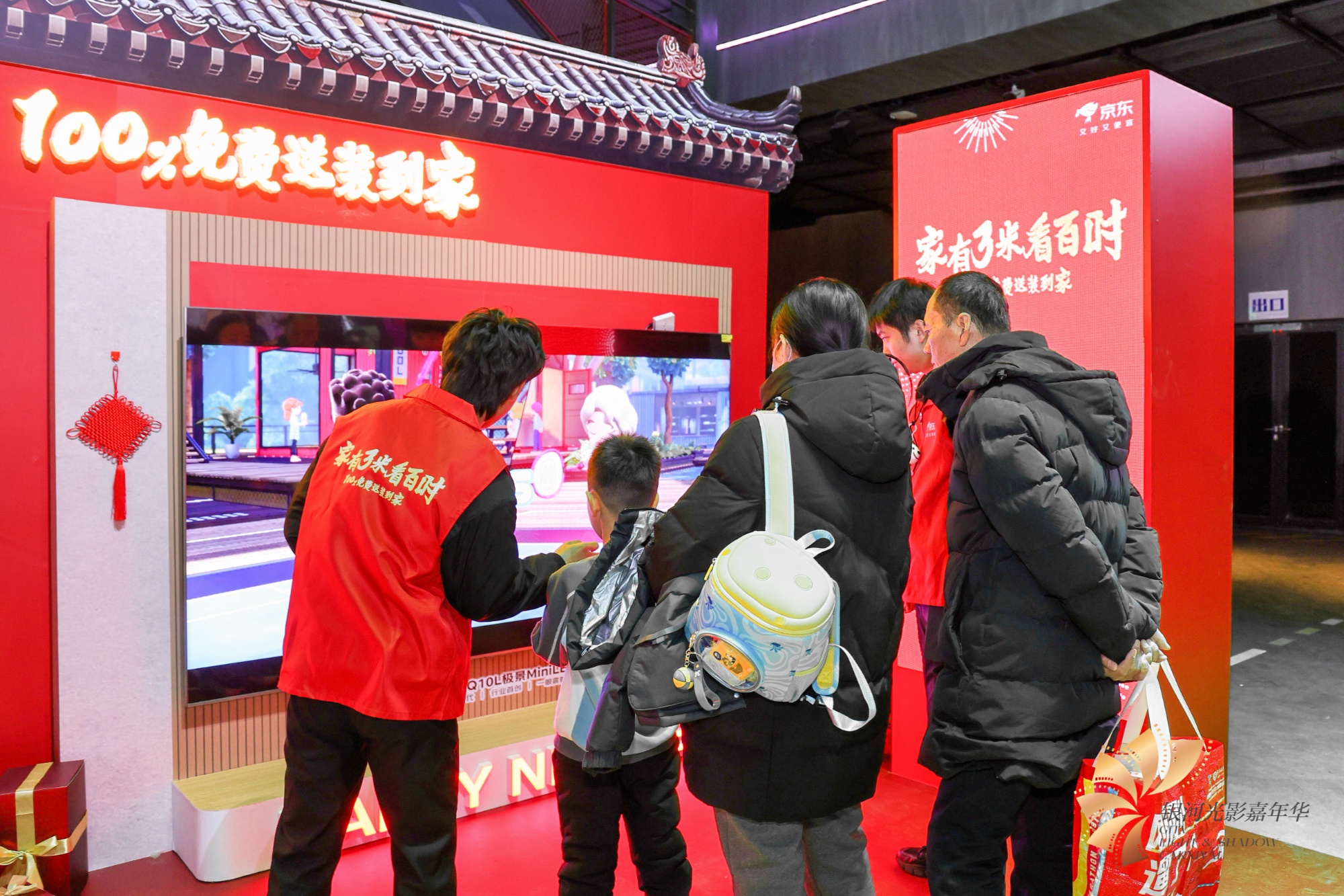 其中,GITV小米电视以“承包客厅欢乐时光”为主题,打造沉浸式家庭娱乐空间。现场不仅可以体验大屏观影与高品质音乐带来的视听震撼,还设有家庭KTV及大屏游戏互动专区,直观展示小米电视如何以海量内容与多元场景,满足不同年龄层的娱乐偏好;京东电视展台则侧重打通消费链条,其主推的“三米看百寸”观影方案和“免费送装”服务,直接瞄准了用户在沉浸式体验后可能产生的硬件升级需求,提供了从体验到购买的一站式解决方案。