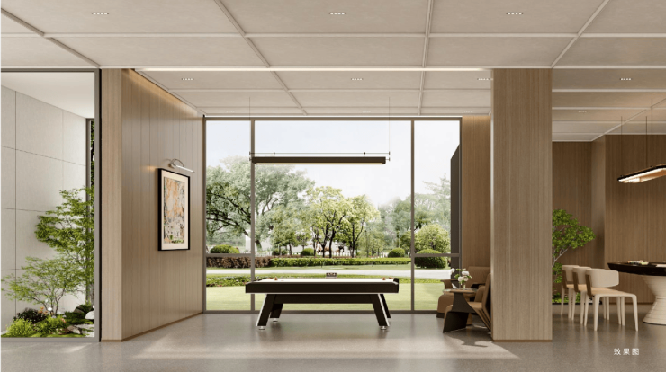 在社区规划上,项目遵循 “人与自然和谐共生” 的设计理念,打造了 “一核、三轴、五组团” 的景观布局。“一核” 即约 1.9 万平方米的中央景观核心,包含阳光草坪、水景喷泉、景观廊架、休闲座椅等元素,是社区的生态绿肺与休闲中心;“三轴” 分别为南北向的礼仪景观轴与东西向的生态景观轴、生活景观轴,串联起社区内的各个功能区域;“五组团” 则以 “童趣、康养、运动、静谧、邻里” 为主题,打造了不同风格的景观组团,每个组团都配备了专属的休闲设施,满足不同年龄段业主的需求。
